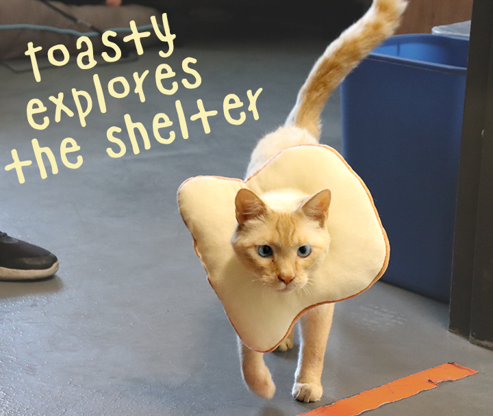 His little Frankenstein butt is healing nicely, and he’s been delighted to get to come out of the little kennel and go for little walks around the shelter with Doctor (Dr. Norris, our vet), saying hello to everyone (absolutely everyone who works here wants to get some of those Toasty pets and purrs!)